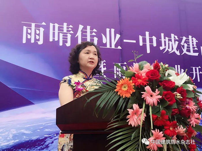 隨后,湖北防水協會會長桂春芳女士代表湖北防水協會在開業慶典大會上發表重要講話,她對湖北雨晴由最開始的施工企業轉型為防水系統服務商的工程進行了簡要介紹,并對之前雨晴承接的眾多國家大型、重點項目的防水工程予以肯定,并對雨晴在湖北乃至華中地區較高知名度,美譽度,影響力予以了肯定。她還說:當前,高質量發展是新時代的要求,也是防水行業新時代的使命,并希望雨晴集團在產品質量、工程質量和服務質量的管理上進一步做深做透做細,日益精進。心無旁騖造產品、一絲不茍干工程、全心全意做服務,使雨晴集團快速進入高質量高效益發展的康莊大道。之后授予雨晴公司“湖北省建筑防水協會施工產業技術聯盟促進會副會長單位”。